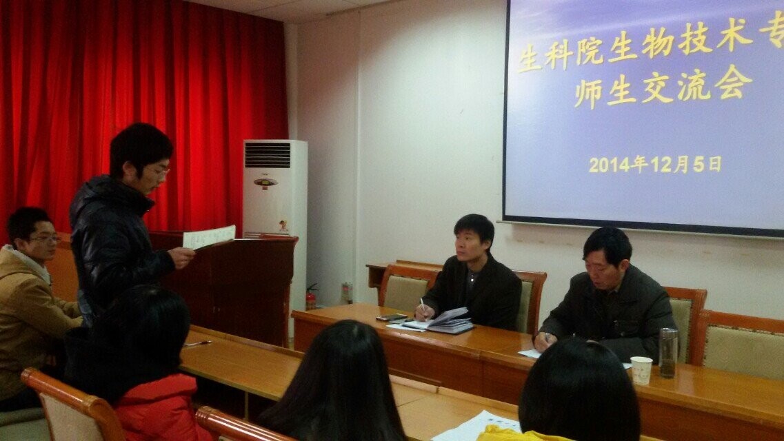 12月5日上午,2014级生物技术班学生齐聚9428cn太阳集团二楼报告厅,与生物技术系主任居超明教授进行了亲切深入的专业思想与生涯规划交流。