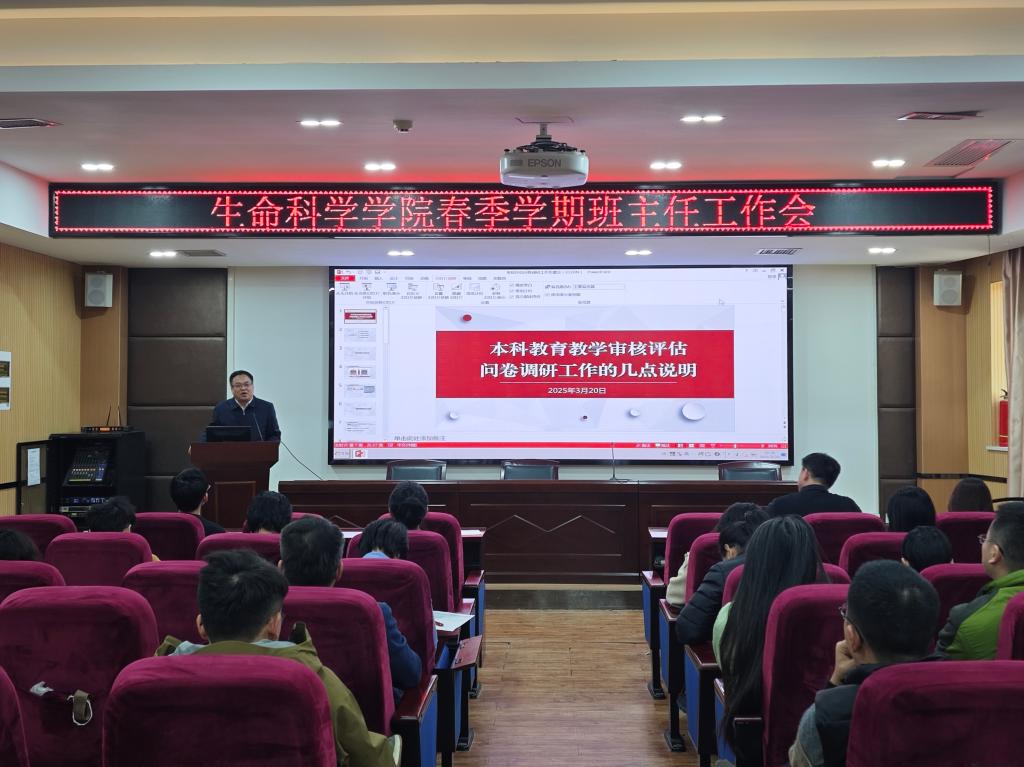 (通讯员:雷力)3月21日,生科院在二楼报告厅召开春季学期班主任工作会,围绕本科教育教学审核评估、学生日常管理、毕业生就业工作等进行专项部署与交流。学院党委书记黄裕钊、党委副书记韩凯、副院长杨之帆、副院长吴姗,全体班主任、辅导员参加会议。会议由辅导员沙秋月主持。 会上,副院长杨之帆首先就“本科教育教学审核评估”专项工作进行重点部署,要求班主任积极配合学院,确保高质量完成评估任务。党委副书记韩凯向与...