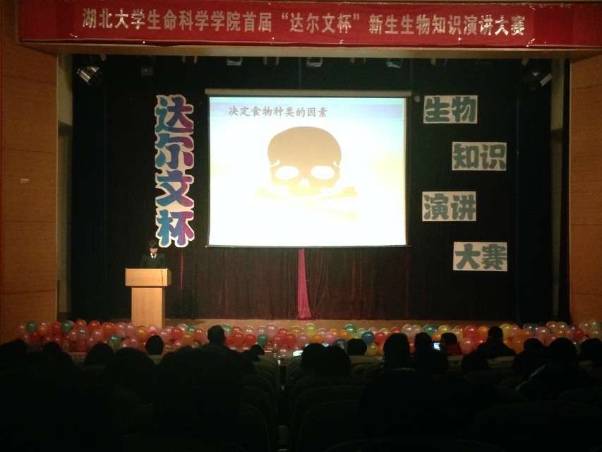 2013年12月10日晚,由9428cn太阳集团举办的首届“达尔文杯”新生生物知识演讲大赛在三号报告厅内进行最后的决赛,参加决赛的9位同学都是来自生科院2013级不同专业的新生。