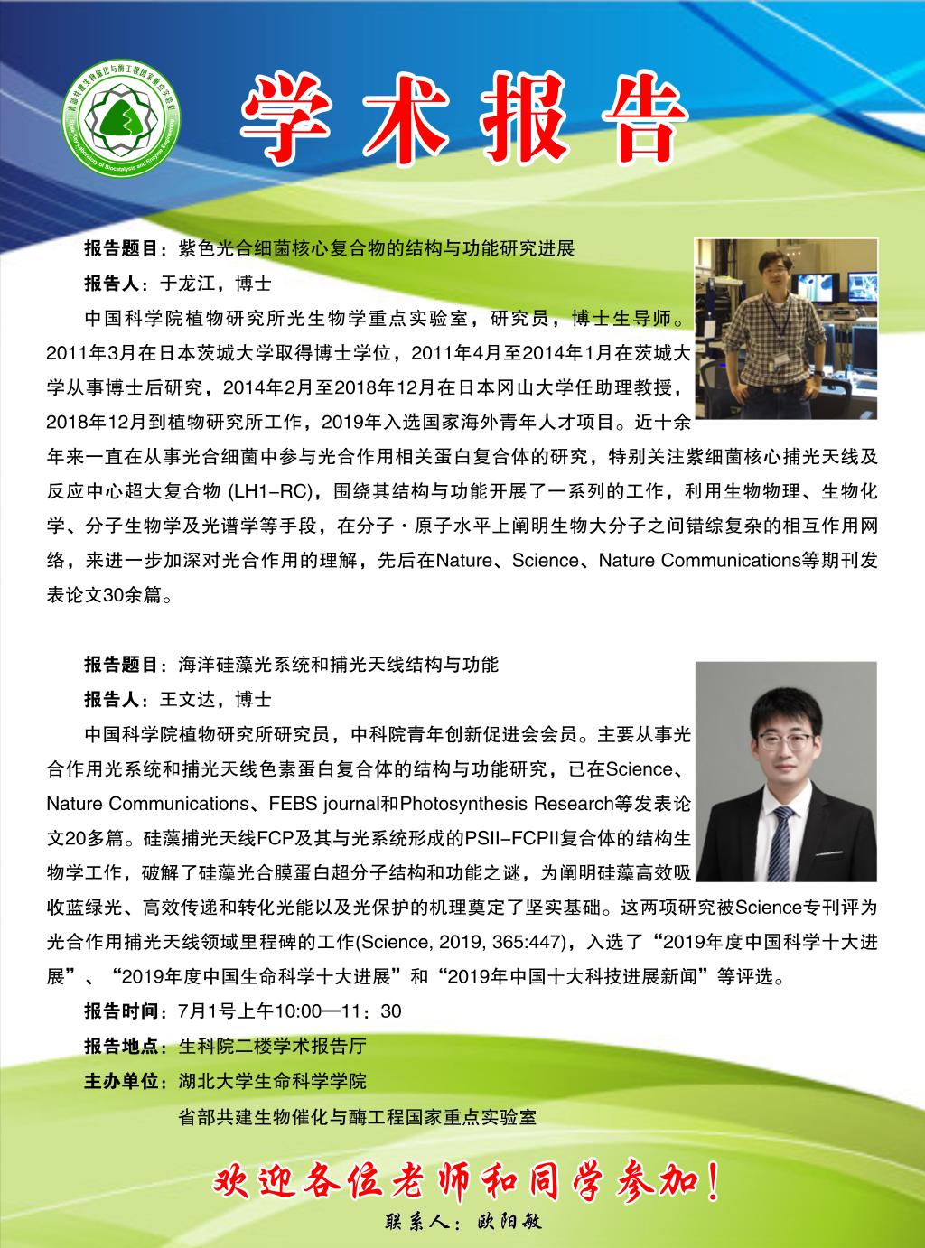 学术报告:紫色光合细菌核心复合物的结构与功能研究进展;海洋硅藻光系统和捕光天线结构与功能
