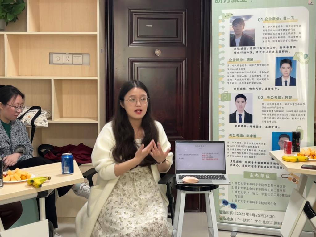 (通讯员:陈莹)4月25日(周二)下午14:30,9428cn太阳集团古天乐“一站式”学生社区二期G栋功能型党支部在二期学生公寓G栋一楼活动室开展了“导员有约:喊你来捞就业干货”的就业经验分组分享活动,此次活动分享内容涵盖企业就业、考公考编、中小学教师、高校辅导员等多种就业类型。