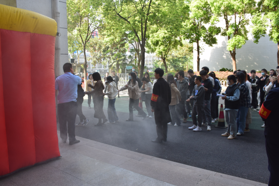 理论培训结束后,同学们分组列队集中到温室门口,由教官现场指导如何正确使用干粉灭火器,将学到的理论知识运用于实践。在教官的指导下,分组进行安全屋烟雾逃生演练。教官对每组演练中所出现的问题进行分析和解读,提醒同学们遇到突发事件时应当冷静处理,看清逃生标志,有序撤离。