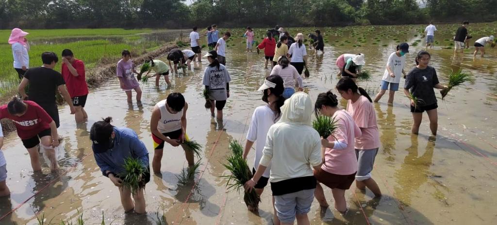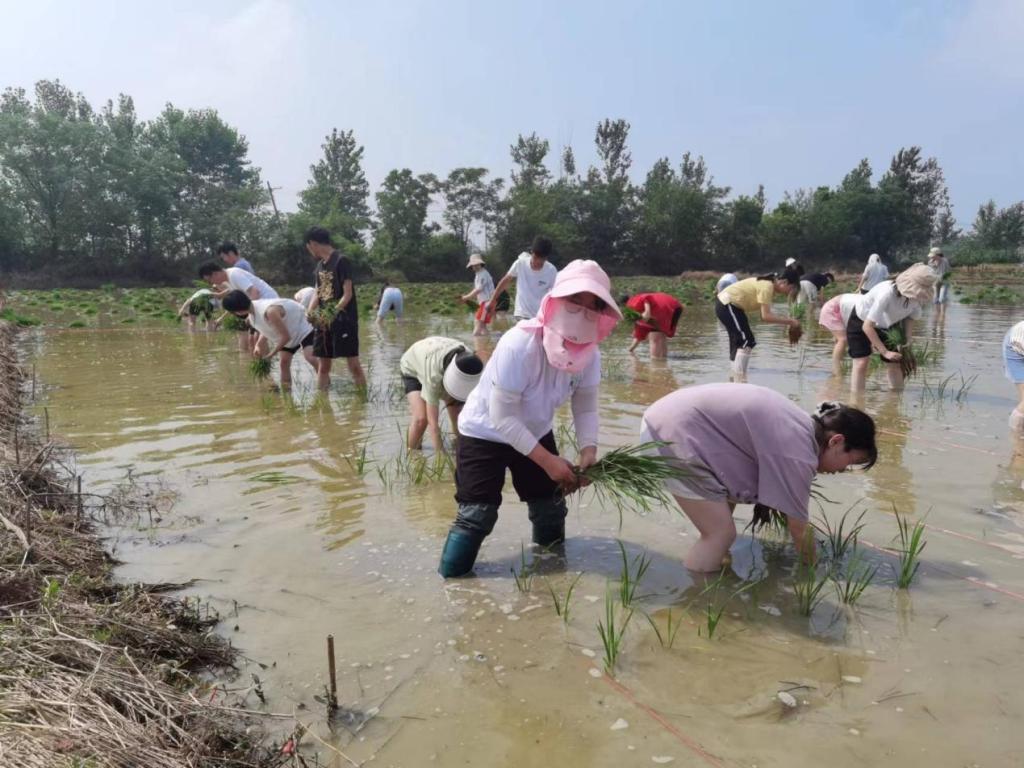同学们热火朝天地在秧田里劳作