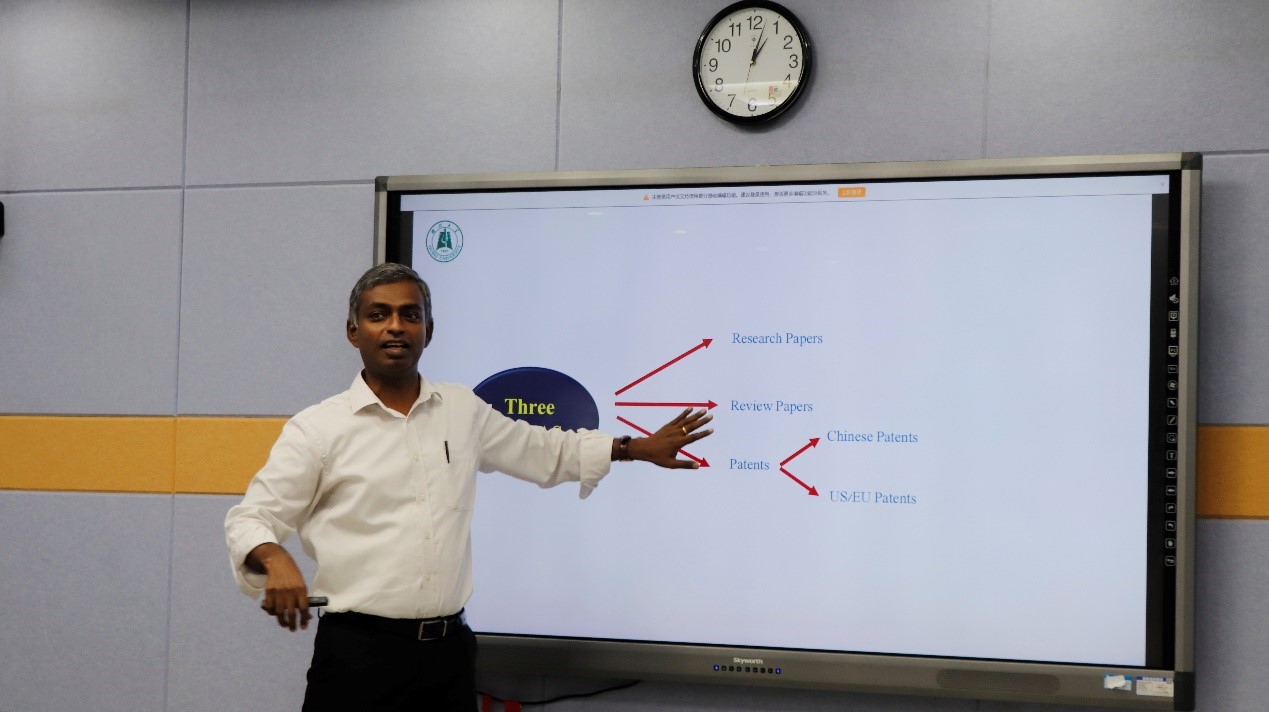在英语写作培训环节,外籍教师Jonathan Nimal给青年教师们分享了3个小时的内容。Nimal教授从英文综述素材收集、撰写方法,以及研究型论文设计、构思、实验、撰写和杂志选择方面提供了有启发性的观点;并且着重强调国际专利申请对于保护重要研究成果的必要性和紧迫性。Nimal教授以自己丰富的个人经历作为实例,从过来人的角度给老师们提了众多“避坑”建议,令人受益匪浅。