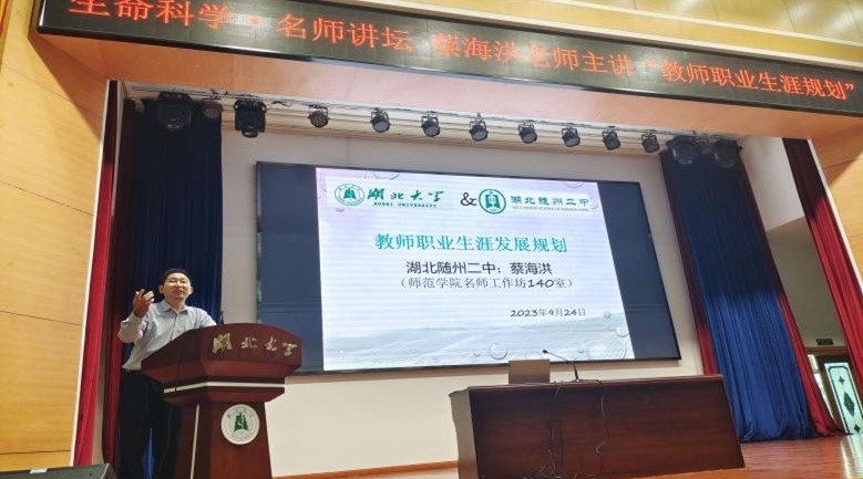 报告伊始,杨之帆院长向同学们介绍报告人,鼓励同学们认真听讲,积极提问。随后,蔡海洪老师款款地走到台上,开始报告。报告中,蔡海洪老师首先介绍了自己从教二十七年以来的发展与蜕变,他以自身为例,总结了个人成就以及不足之处,同时指出“作为教师,制定职业发展规划很有必要”。蔡海洪老师在报告中强调“职业生涯规划应有明确的发展目标”,他还列举了教育教学目标、教育管理目标、科研目标、职称目标等等以及目标制定的原则。另外,他向同学们介绍了教师专业发展的含义、特点和内涵,以及教师职业素养的下位概念,如思想品德素养、专业知识素养、职业技能素养等。随后,蔡海洪老师以自己所在的工作单位随州二中为例,向同学们介绍了随州二中生物组近十年教师招聘及发展情况,为还未或者即将走入招聘市场的同学提供参考,使同学们深入地了解到真实的教师招聘信息以及教师入职后的发展状况。最后,蔡海洪老师提出:“设定长远的生涯目标,将大目标分解成子目标,按照子目标制定具体的时间表,先完成一个个小目标,最终实现长远目标。希望同学们早做规划,制定目标,既仰望星空,又脚踏实地,不负韶华,奋力前行,做更加优秀的自己!”