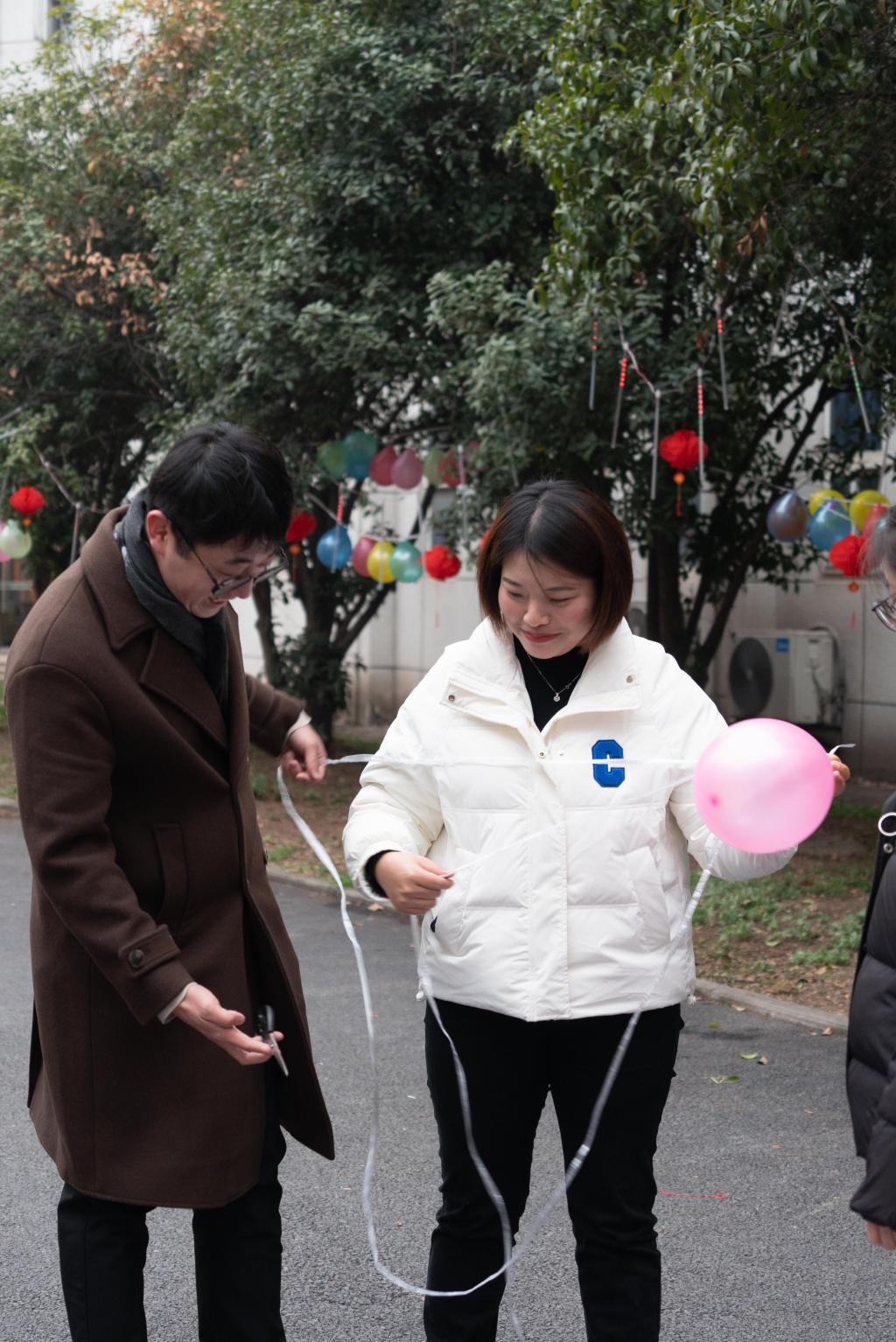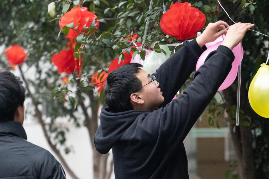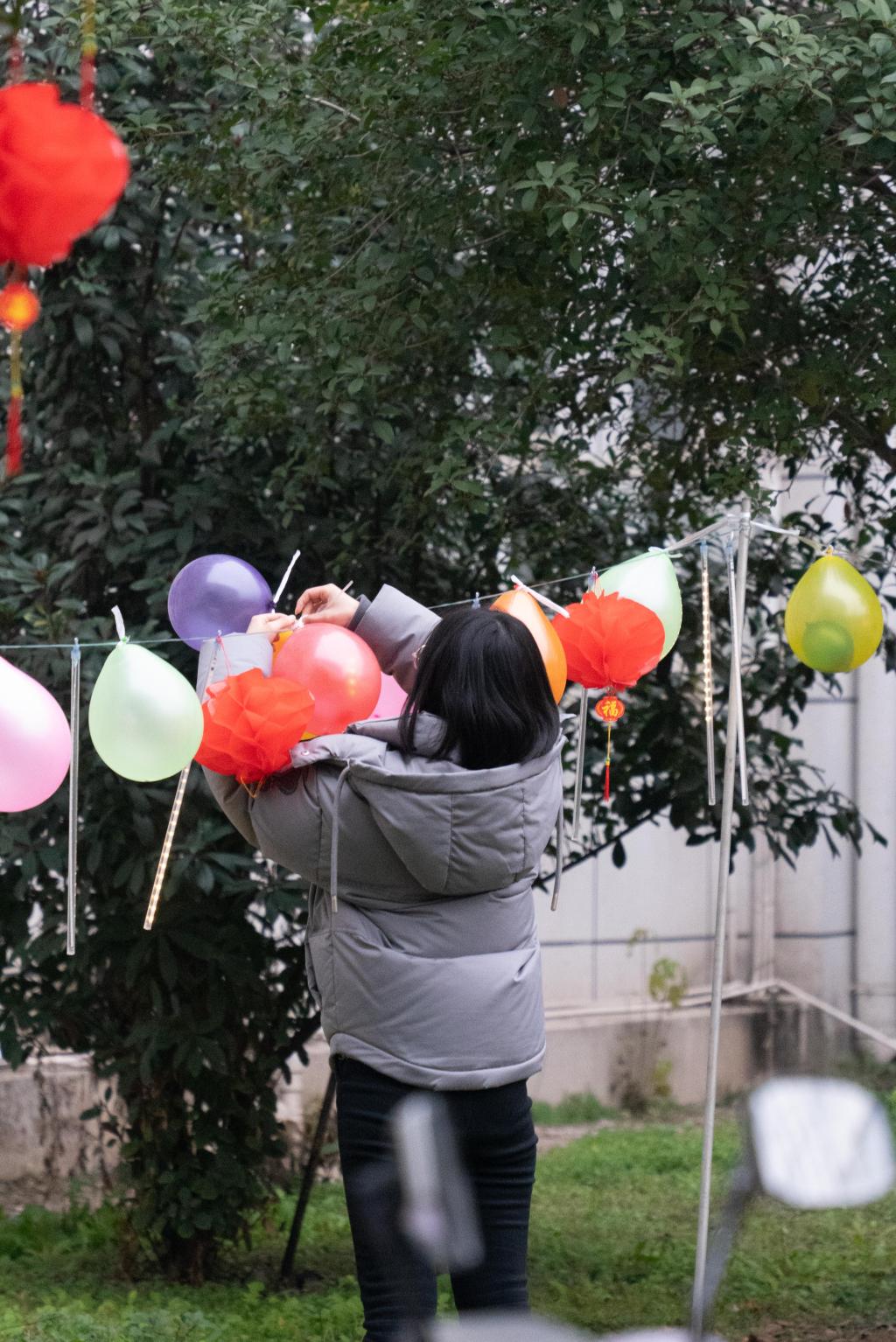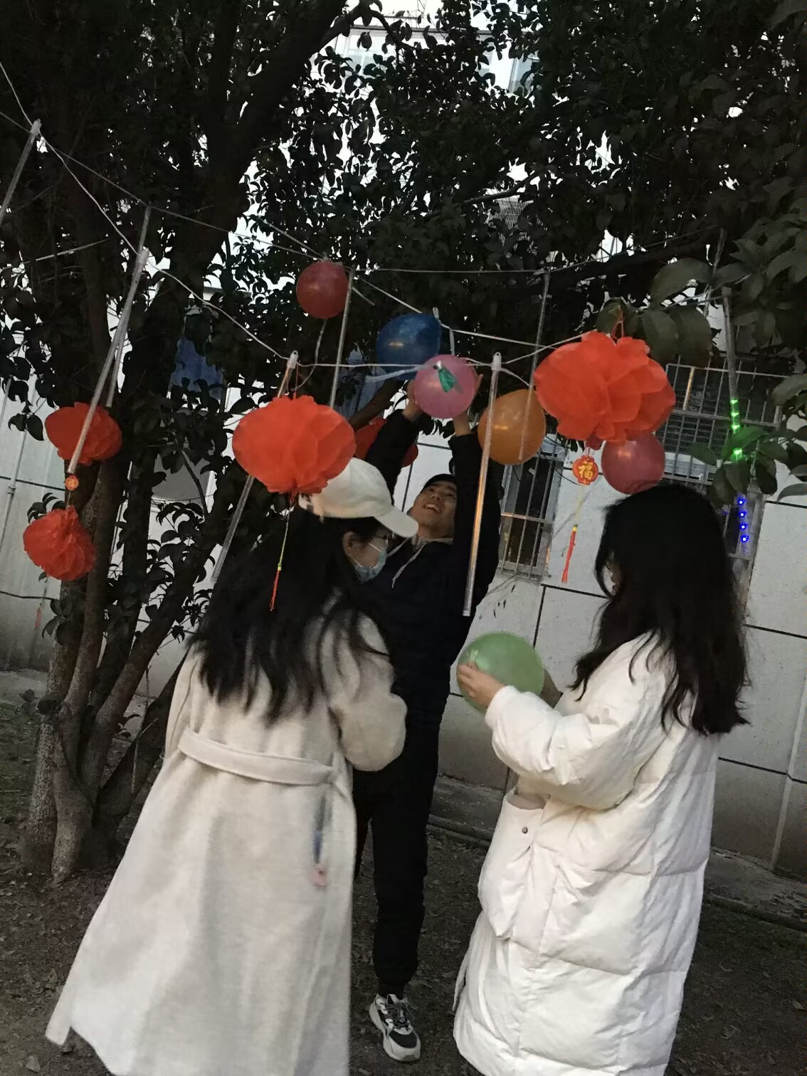 5日下午四点,在院学工办老师们的带领下,生科院青年志愿者行动指导中心的同学们开始进行活动场地布置。第一小队的同学们心灵手巧,小心翼翼地将红灯笼展开,撕下双面胶,把灯笼粘成一圈。第二小队的男生们利用身高优势将一个个红彤彤的的灯笼挂上桂花树的高枝,中间再穿插流光彩灯,交相辉映,暖黄的灯光衬在老师同学们忙碌的身影上,整条道路都充满着喜庆的节日气氛和浓郁的文化氛围。第三小队的同学将写有谜面的纸条放入气球,充气后打结,用彩带串联起来,等待着同学们到来,戳破气球,让灯谜破“壳”而出。第四小队布置现场的桌椅和锅碗,保证活动所需物资的充足。大家各自忙碌,为元宵庆典增添欢乐的氛围,软糯的元宵,以及生科一家的团圆。