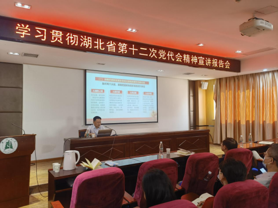祝欣以《奋进新征程建功新时代》为题,由近年来习近平总书记历次考察湖北重要讲话的核心要义和精神实质引入,从湖北省第十二次党代会情况简介、准确把握过去的工作成绩和启示、准确把握未来五年的工作目标和举措等3个方面对省第十二次党代会报告进行了全面深入解读。