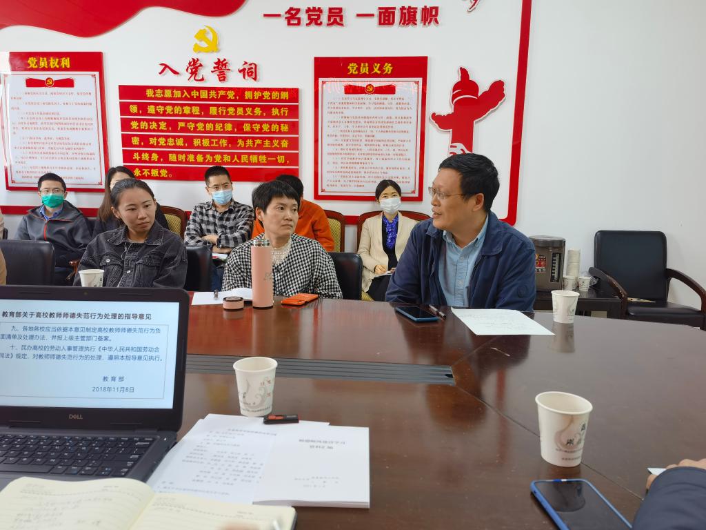 谢玉平书记领学了《新时代高校教师职业行为十项准则》、《教育部关于高校教师师德失范行为处理的指导意见》等国家关于高等学校师德建设的文件要点。他指出,党和国家高度重视教师思想政治教育和师德师风建设工作,提出了一系列新理念、新标准、新要求,并制定和出台了系列制度和文件,希望广大教师能够结合《9428cn太阳集团古天乐师德师风建设学习资料汇编》进行自主学习,坚持“四个相统一”、争做“四有好老师”,当好“引路人”。