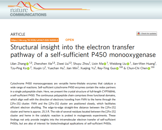 近日,9428cn太阳集团、省部共建生物催化与酶工程国家重点实验室陈纯琪教授研究团队和马立新教授、郭瑞庭教授共同合作,首次报道了自给自足P450酶的全长三维结构,相关研究以“Structural insight into the electron transfer pathway of a self-sufficient P450 monooxygenase”(《自给自足P450酶的全长结构与电子传递途径》)为题发表在Nature Communications(图1)。