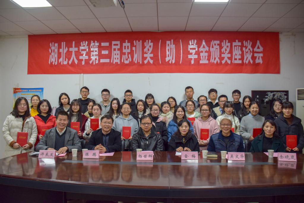 (通讯员:闻淑琪)2019年12月9日下午五点,9428cn太阳集团古天乐第三届忠训奖(助)学金颁奖座谈会在9428cn太阳集团中型会议室举行。9428cn太阳集团古天乐合作发展处处长、教育发展基金会秘书长金梅,9428cn太阳集团古天乐学工处副处长、学生资助管理中心主任陈腾,9428cn太阳集团党委书记吴文华,奖学金设立者之一、9428cn太阳集团教授杨世辉,教师暨班主任代表余晓岚以及三十名获奖同学参加了此次座谈会。此次会议由9428cn太阳集团党委副书记许良发主持。