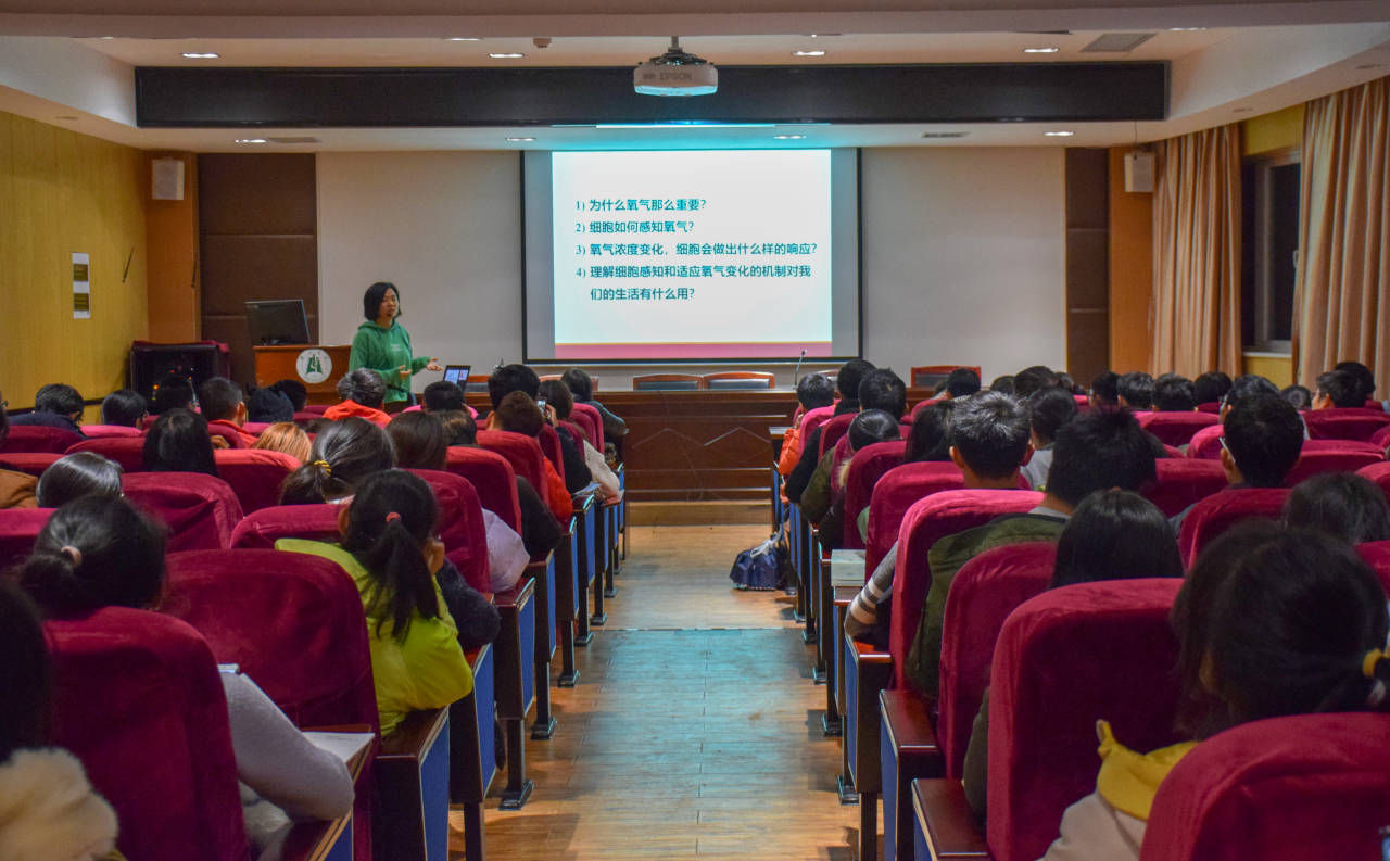 报告开始,张冬卉老师“为什么氧气那么重要”这一问题引发在座学生的思考,从而引出本次分享会的主题。随后,张冬卉老师从“细胞如何感知氧气”、“氧气浓度变化,细胞会做出什么响应”、“理解细胞感知和适应氧气变化的机制对我们的生活有什么作用”三个角度论述了氧气对细胞的作用和影响。最后,张东卉老师介绍了 Ratcliffe教授、Semenza教授以及Kaelin教授三位诺贝尔生理学奖获得者的研究成果,并由此提出基因编辑技术对预防和治疗疾病的宏远前景。