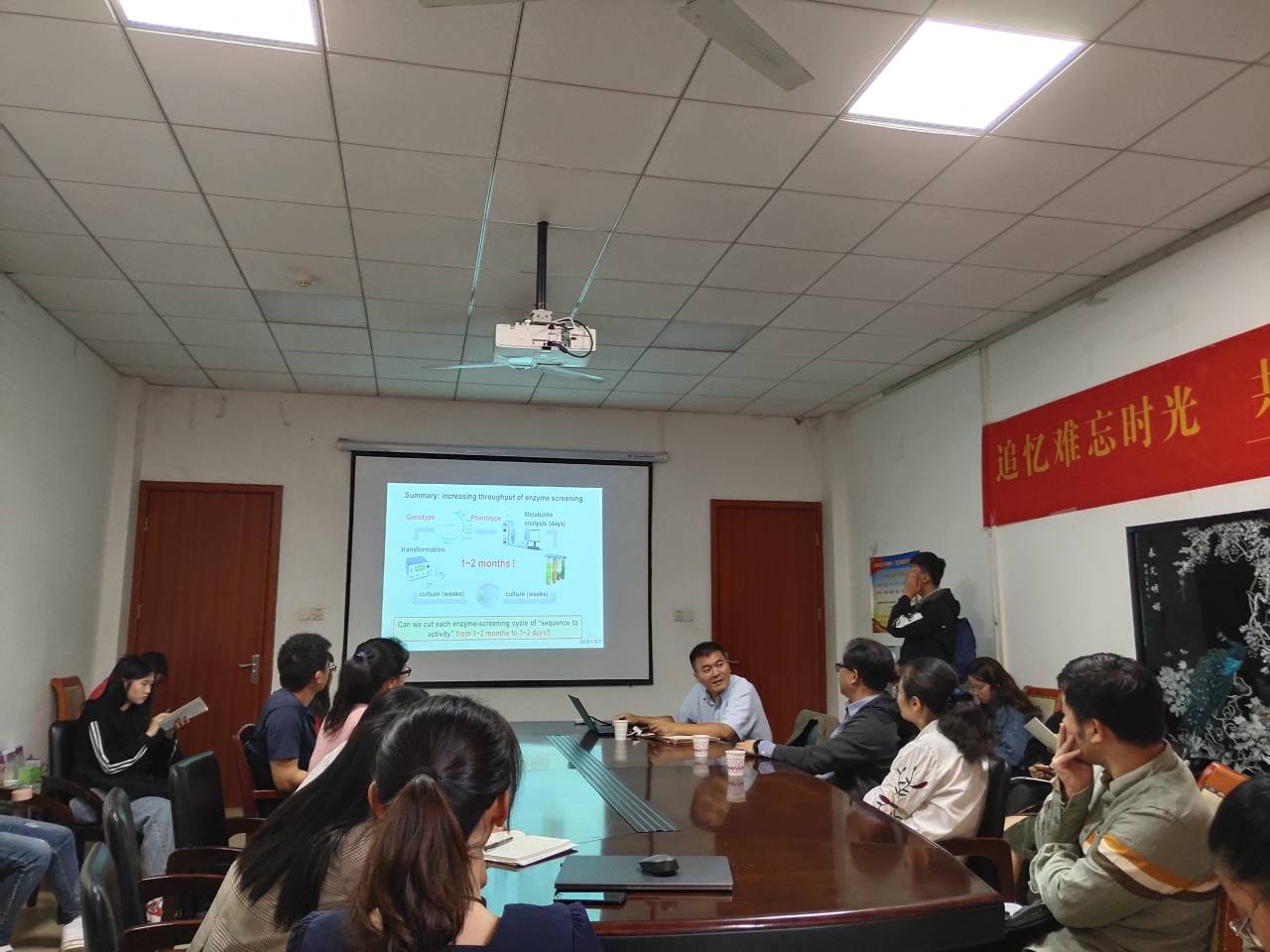 报告于九点半准时开始。报告之初,徐健研究员介绍了一项共性技术——单细胞中心,这是一种能在细胞层面来研究生物多方面(比如:酶,基因等),不需要标记的、能直接研究任何细胞、同时不破坏细胞的手段与设备,比如有以基因组工程组、工具酶组、微流控系统组、生物信息组为基础,外加单细胞示范部和单细胞仪器工程部的工作组成的单细胞大数据与装备。接着,徐研究员以酶为例,形象具体地向大家讲解该项技术的整个运行流程,这将是新的顺序(先筛选再培养)的高效率流程。