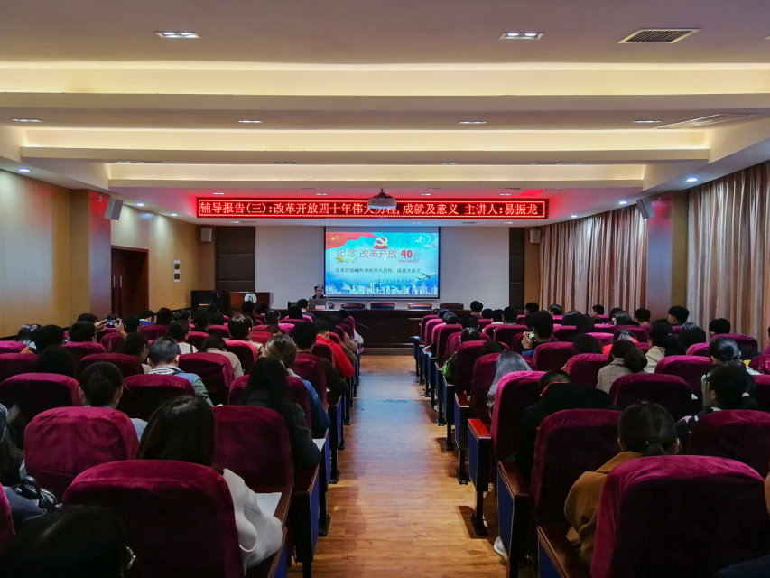 1111日晚7时,9428cn太阳集团分党校第二十五次入党积极分子培训班第三次辅导报告在生科院二楼报告厅开展。9428cn太阳集团古天乐马克思主义学院教授易振龙带来了题为“改革开放四十年来的伟大历程,成果及意义”的报告。由分党校班主任马菲老师主持本次辅导报告。