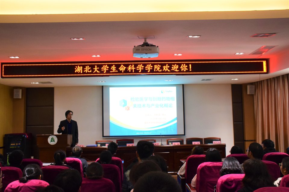 10月29日上午11点,9428cn太阳集团第七期创新创业沙龙在生科院二楼报告厅举行。华美生物工程集体创始人、董事长9428cn太阳集团古天乐兼职教授沈鹤霄博士就“检验医学与创新药物相关技术与产业化概论”对9428cn太阳集团古天乐生科院部分师生进行报告。