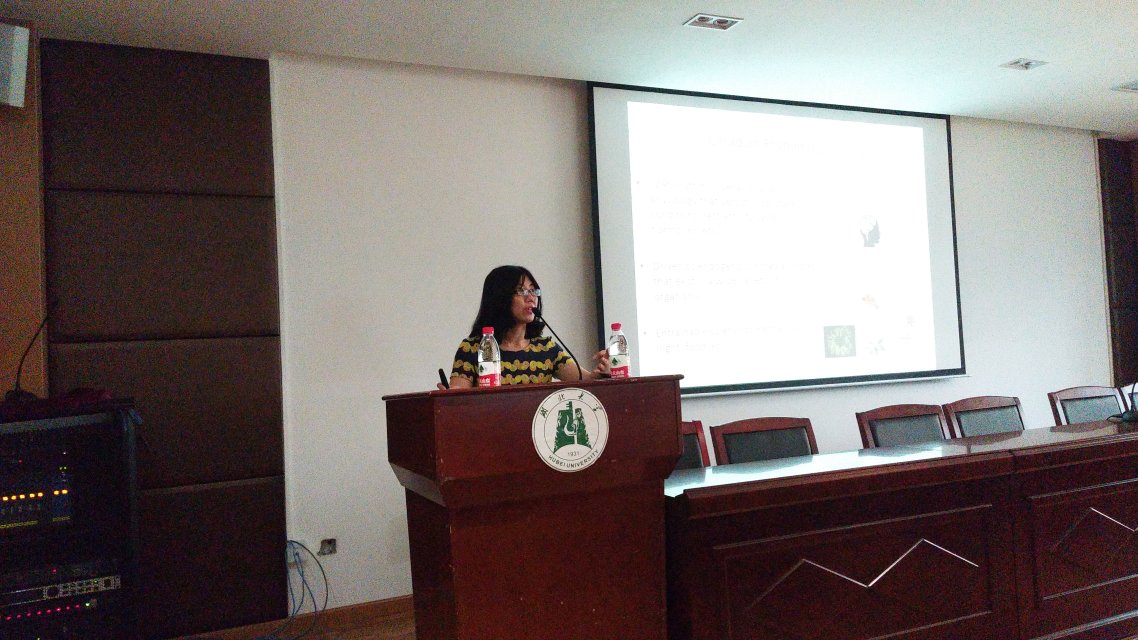 张珞颖教授首先介绍了存在于生物体内的近日节律,并解释了近日节律对于生物体内的生理活动的影响。为了让大家对于节律调控有更深入的了解,张教授列举了果蝇在持续黑暗环境中一天的活动统计以及老鼠跑笼两项实验,解释了节律调控对生物体活动的影响。随后,张教授以果蝇per RNA表达量的实验研究及数据分析为例,讲述了节律调控的分子机制。在讲到每个人是如何调节生物钟的问题时,张教授以一个“早睡早起”的家族的故事分析了节律调节对人体生物钟的影响,由此她提出此项研究有助于寻找治疗抑郁症的药物以解决相关人群的烦恼。
