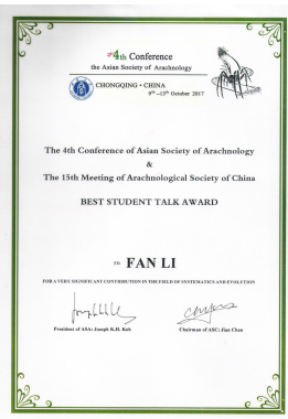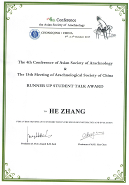 "Phylogeny of Chinese Pseudopda spiders (Araneae: Sparassidae) based on target-gene analyses”的学术报告,分别荣获大会一等奖(BEST STUDENT TALK AWARD)和大会二等奖(RUNNER UP STUDENT TALK AWARD)