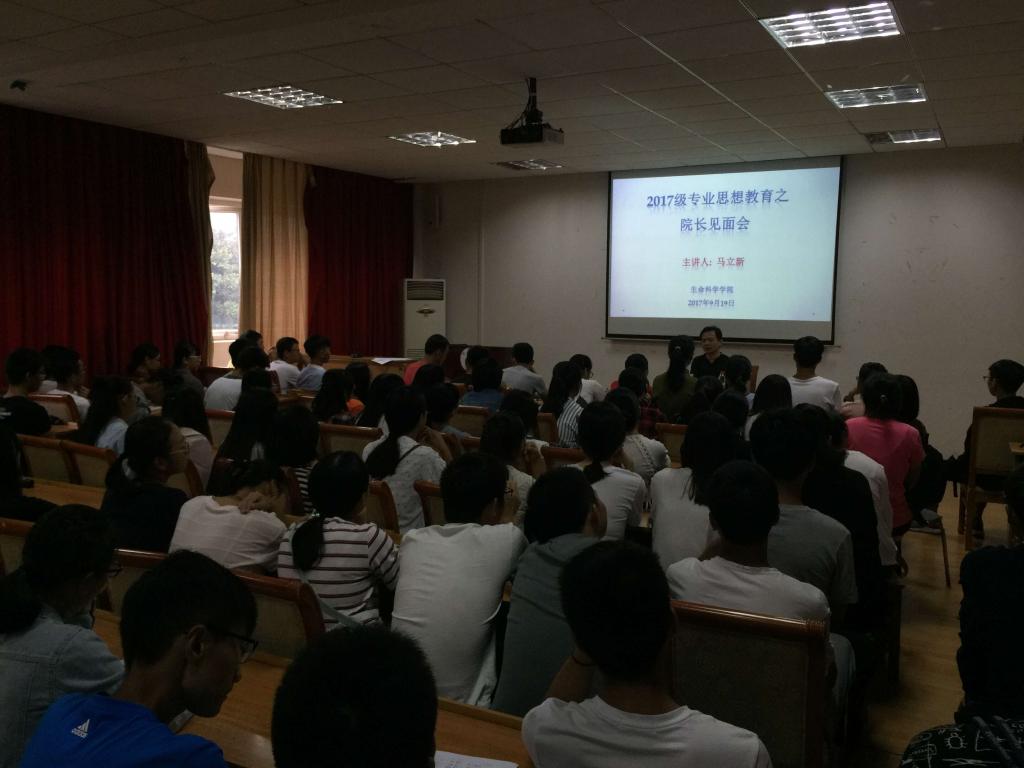 919日下午4点,2017级新生入学教育系列活动开展专业思想教育第一讲。马立新院长做客生科院二楼报告厅,主讲了“老马识途”马院长与新生见面会。