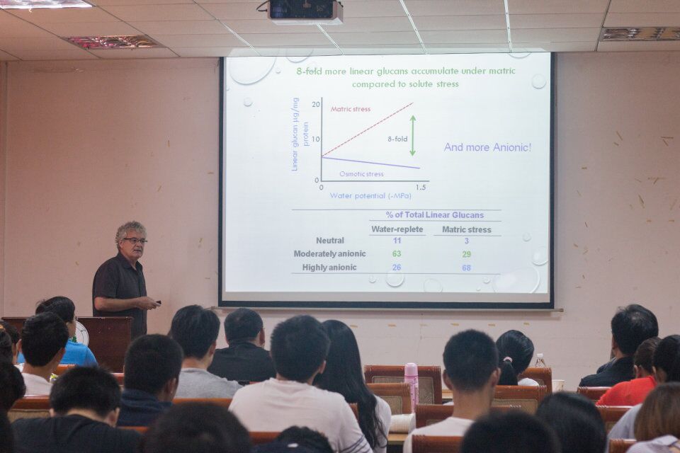 经主持人介绍后,Larry Halverson教授向大家介绍了今天学术报告的主题,即用系统生物学方法来理解微生物-微生物及植物-微生物相互作用机制。在报告中,他通过PPT跟大家讲解了增加8倍直链葡聚糖份额相对于溶质压力在基体下的积累机制,并用图表的形式向大家展示了水势与直链葡聚糖在蛋白质中含量的关系等。