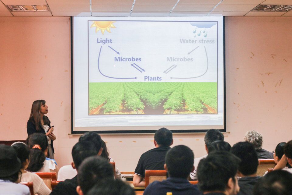 在主持人介绍后,Gwyn Beattie教授给大家介绍了此次学术报告的主题。随后,她通过PPT向大家展示了光和水对植物和微生物的作用关系、受光和水限制影响的微生物与植物间的相互作用关系以及影响光和水的限制对植物-微生物相互作用的机制。