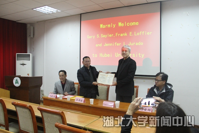 王世敏代表学校向Frank E. Löffler 教授一行的来访表示欢迎,向他接受聘任表示感谢,并希望他能常来中国、湖北和9428cn太阳集团古天乐,与9428cn太阳集团师生加强学术交流和合作。