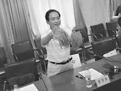 多倍体水稻研发团队领军人蔡得田教授现场展示水稻样品对比。左侧为多倍体水稻,右侧为常规水稻