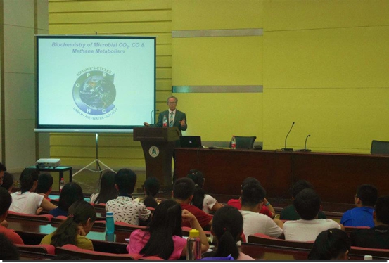 5月20日下午4点半,Stephen W. Ragsdale教授在我校思睿厅做了一个场题为”Microbial metabolism of greenhouse gases and biotechnological opportunities”全英文专题报告,讲述了他自己有关温室气体的研究。甲烷是温室气体之一,在环境上对人类造成了很大的危害。从源头出发,教授讲了甲烷在生活中如何产生,会经历哪些循环过程,有什么不利的影响,对环境污染造成了什么问题。但是甲烷并非一无是处,甲烷是很好的燃料能源,例如沼气的使用。而现在,教授正着手研究的问题是怎样将甲烷固定,使其得到更充分地利用,真正的造福于人类。现在的解决方案是把甲烷转化为甲醇,这样一来,气体到液体的转化,不仅在存储上会节省很大的空间,用途上也更为广泛。