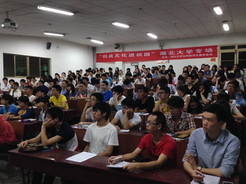 许一兵先生通过讲解日本军队侵略中国的历史,放映有关于日军侵略武汉时的纪录片,展示日军旭日旗和军刀等藏品的形式,启发同学们认真思考日本侵华战争所带给中国的危害,启发同学们要珍惜在世界反法西斯战争暨中国抗日战争胜利70周年背景下所来之不易的世界和平与繁荣。
