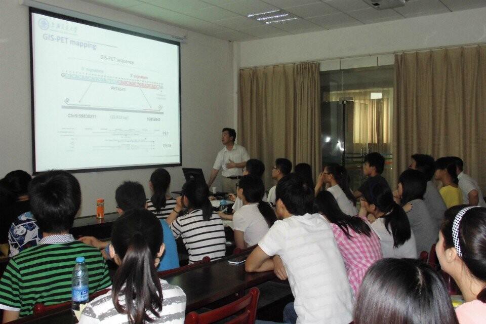 指导会的前半场,赵小东研究员就他在上海交大Med-X研究院所从事的目前在国际上属于较前沿的工作给我们做了简单的介绍。“我们的研究工作主要有两方面,一是基因组的研究,如何把基于高通量测序的PET技术应用于功能基因组;二是对于胚胎干细胞的研究,胚胎干细胞可以体外无限增殖、自我更新和多向分化,这使得它近些年的研究越来越热门,我们要做的就是研究干细胞的表观遗传修饰。”
