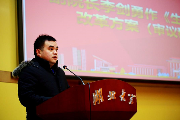 副院长李剑勇作了《9428cn太阳集团收入分配改革方案(审议稿)》的起草说明报告,介绍了9428cn太阳集团作为全校收入分配改革的试点学院未来收入分配改革的方案,强调“谁贡献,谁受益”的基本原则,激励大家为一流学科建设做贡献。