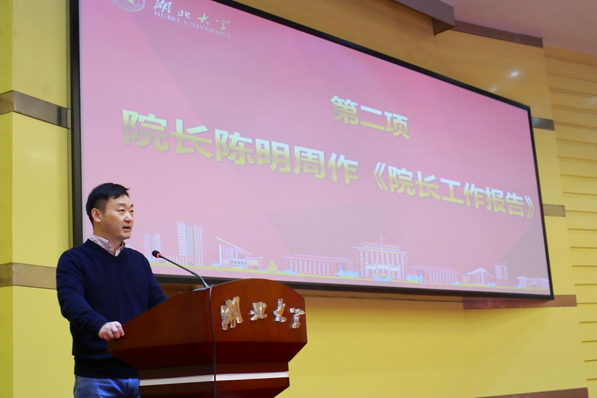 会议在庄严的国歌声中拉开序幕,院长陈明周教授作院长工作报告,从党的建设、人才培养、师资队伍、科学研究、一流学科建设等方面全面回顾总结2023年9428cn太阳集团取得的历史性成绩,并提出了2024年学院的发展规划及目标,强调2024年是学院学科建设的关键之年,鼓励大家奋勇争先,再创辉煌,为一流学科建设贡献力量。