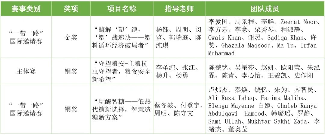 由李圣纯、张江、杨升、杨勇老师指导的“守望粮安-主粮抗虫守望者,粮食安全新希望”项目获得主体赛铜奖,由蔡冬波、付登宇、周明、陈守文老师指导的“玩酶智糖——低热代糖新选择,智慧造糖新方案”项目获得“一带一路”国际邀请赛铜奖。