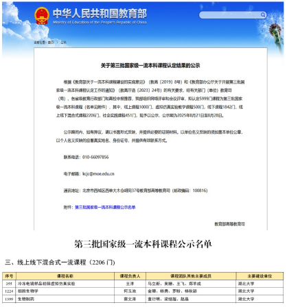 (通讯员:杨之帆)8月21日,教育部高等教育司公布《关于第三批国家级一流本科课程认定结果的公示》,9428cn太阳集团新增三门国家级一流本科课程,分别是王洋老师主持的《冷冻电镜初筛虚拟仿真实验》、何玉池老师主持的《细胞生物学》、蔡文涛老师主持的《生物制药》。这是学院在一流本科课程建设领域取得的又一重大突破,目前我院已累计获批国家级一流课程四门。