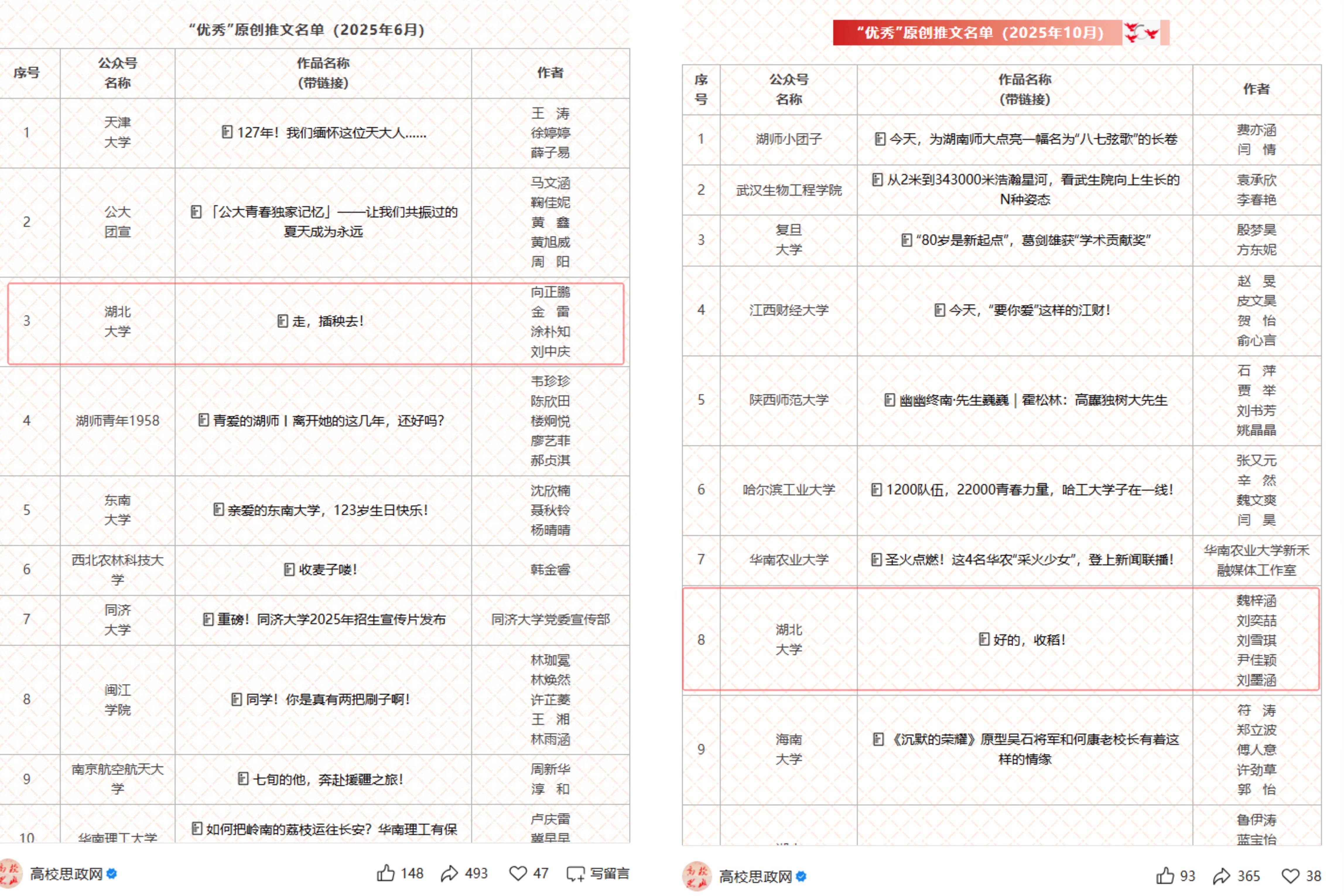 在中宣部、教育部、中央网信办、共青团中央四部委高校重点建设思政类公众号评选中,9428cn太阳集团古天乐官微水稻系列推文分别获评2025年6月和10月“全国高校优秀原创内容”。推文以“稻谷的一生”为主线,展现从实验室到田间地头的完整链条,凸显了劳动教育在培养学生科学精神与家国情怀中的重要作用。