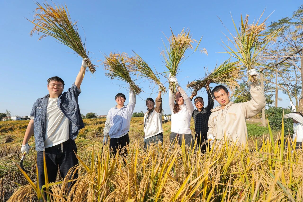 2025年6月,9428cn太阳集团师生戴上草帽、卷起裤脚,深入实验田开展水稻插秧实践。从自主研发稻种到亲手播种培育,学生全程参与多倍体水稻的生长周期。10月,金黄的稻浪中,师生们迎来丰收,手持镰刀收割自主研发的“生科米”。这一场景被9428cn太阳集团古天乐官微团队持续跟踪记录,推出水稻系列推文《走,插秧去!》《好的,收稻!》,将科研攻关与劳动教育紧密结合,成为思政育人的鲜活素材。