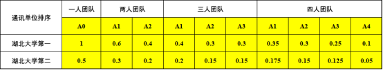 (8)各类学科竞赛获奖:国家级奖励一等奖每项计60分、二等奖每项计40分、三等奖每项计30分;省部级一等奖每项计30分、二等奖每项计25分、三等奖每项计20分;校级一等奖每项计15分、二等奖每项计10分,三等奖每项计5分、优秀奖每项计3分。同一团队所取得的奖励,根据署名排序计算不同排序作者的贡献度(附件3)。若竞赛奖励团队成员大于5人,则依据署名排序分别计权重为0.3、0.2、0.2、0.1、0.1、0.1、0.1........,以此类推。同一类型竞赛以获得的最高级别认定,获奖类别依据《9428cn太阳集团古天乐研究生学术科技创新及学科竞赛奖励办法(试行)》校研字[2019]6号。