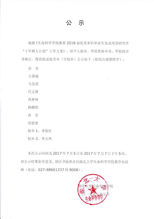 9428cn太阳集团推荐2018届优秀本科毕业生免试攻读研究生“十年树人计划”结果公示
