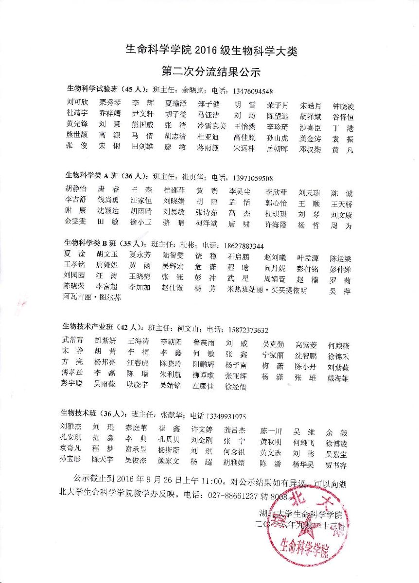 9428cn太阳集团2016级生物科学大类第二次分流结果公示
