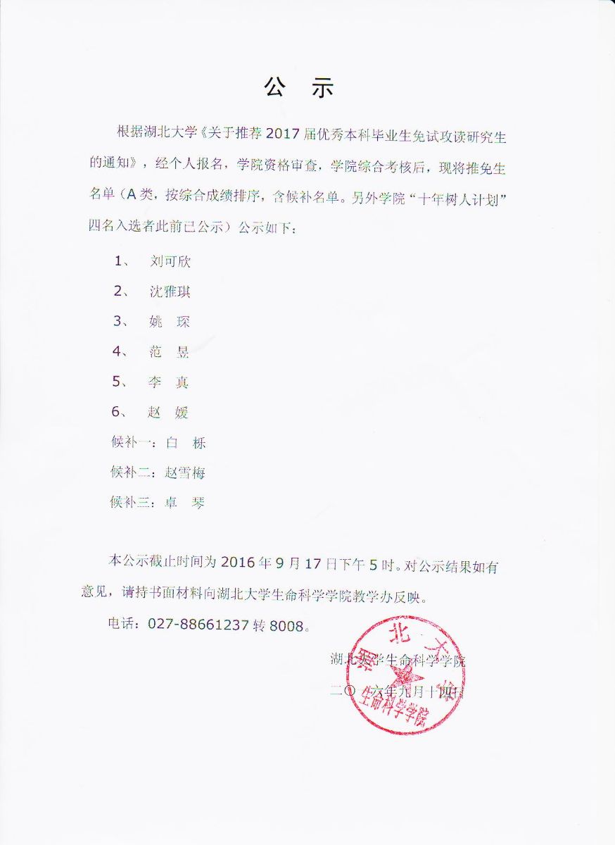 2017届优秀本科毕业生免试攻读研究生结果公示