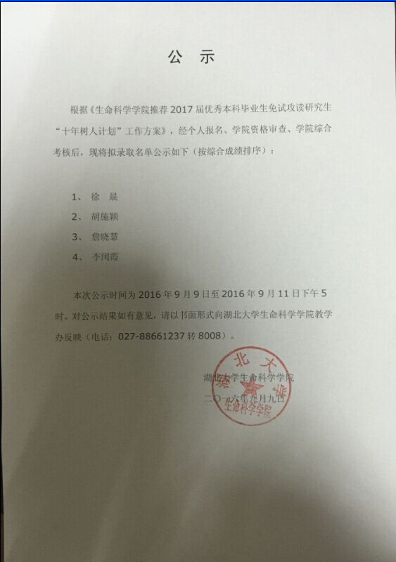 2017届优秀本科毕业生免试攻读“十年树人计划”研究生结果公示