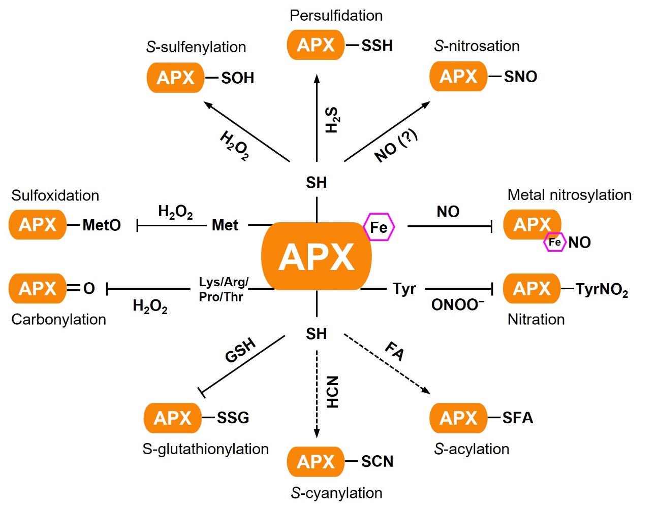 APX是植物细胞中抗坏血酸(ASC)-谷胱甘肽(GSH)循环中的重要酶类组分,以ASC为电子供体将H2O2转换为H2O,同时ASC氧化后又可通过循环还原再生(图2)。作为H2O2的主要代谢酶,APX在植物生长发育和响应逆境胁迫中也发挥着重要作用。细胞质APX的活性受到多种氧化翻译后修饰(OxiPTM)调控,包括丝氨酸残基的次磺酸化修饰(-SOH)、硝基化修饰(-SNO)、硫巯基化修饰(-SSH)、谷胱甘肽化修饰(-SSG)、氰基化修饰(-SCN)、和酯酰化修饰(-SFA),甲硫氨酸残基的硫氧化作用以及酪氨酸的硝化等。