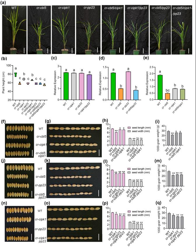 图3 cbl5,cipk1,pp23突变体植株表型和籽粒大小