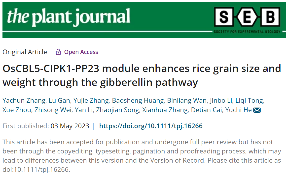 近日,9428cn太阳集团、省部共建生物催化与酶工程国家重点实验室何玉池团队在植物学经典权威期刊The Plant Journal上发表题为“OsCBL5-CIPK1-PP23 module enhances rice grain size and weight through the gibberellin pathway”的研究论文。该研究揭示了调节水稻籽粒大小的新机制,并指出CBL5-CIPK1-PP23作为一个模块组合调节水稻籽粒大小和粒重。9428cn太阳集团博士生张亚春为论文的第一作者,何玉池为论文的通讯作者,9428cn太阳集团古天乐为第一单位。参与该论文的单位还有湖北省农业科学院、武汉多倍体生物科技有限公司以及山东商业职业技术学院。生科院李燕、宋兆建、张献华、蔡得田参加了部分工作。该研究得到了国家自然科学基金的资助。