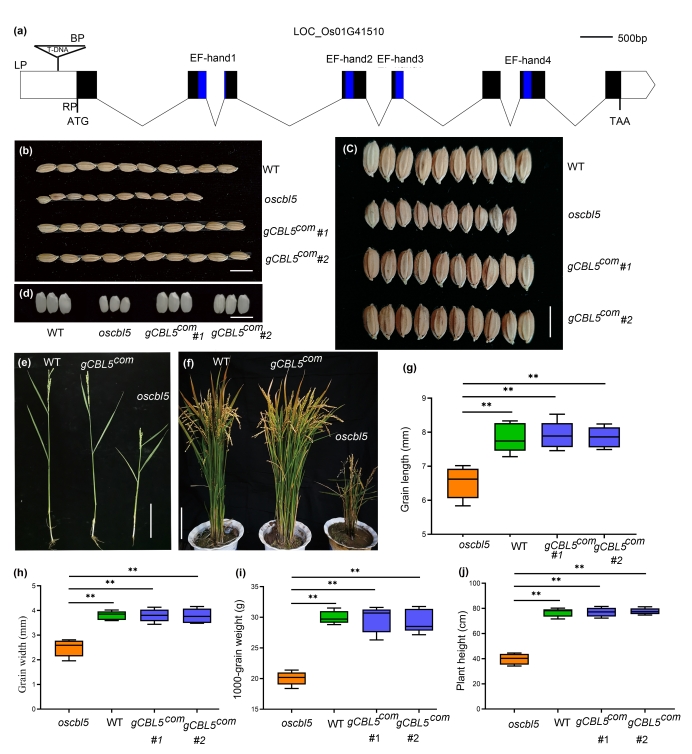 世界上有一半以上的人口以水稻为主要粮食作物,提高水稻产量可有效缓解粮食危机。对于农业领域的所有科学家来说,提高产量是一项长期而艰巨的任务,为了满足人类的需求,仍有必要采取新的策略来提高作物产量。谷粒的长度和宽度与产量密切相关,增加谷粒大小可以有效地提高产量。研究调节水稻籽粒大小的分子机制可以为提升作物产量提供适用的工具,因此被作物育种家和植物科学家广泛关注。虽然已有部分调节籽粒大小的基因被报道,但是水稻籽粒大小的调节机制异常复杂,调控网络仍然不清晰。在这项研究中,我们报道了OsCBL5编码一种类钙调磷酸酶B蛋白,该蛋白显著促进水稻籽粒大小和重量。oscbl5突变体植物产生的种子明显更小、更轻。在oscbl5突变体将CBL5回补后发现籽粒大小又恢复到跟野生型一样的尺寸。