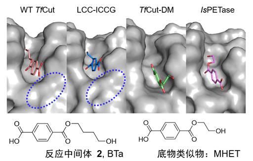 郭瑞庭团队同时获得野生型TfCut和TfCut-DM与底物类似物MHET的复合体晶体结构(图3)。对比发现,野生型TfCut和之前已经报道的LCC-ICCG含有大二元体组分的结构相似,因此活性区入口处较为突出。而TfCut-DM和IsPETase含有小二元体,活性区入口处也较为平坦,更有利于PBAT长链的结合,因此从结构上根本解释了TfCut-DM降解活力提高的原因。