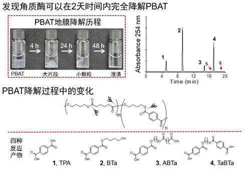 为了解决上述难题,郭瑞庭团队通过大规模筛选、寻找合适的酶,终于发现一种用于降解PBAT地膜塑料的角质酶TfCu。这种酶可以在两天内快速的将PBAT地膜分解成大碎片、小颗粒直至完全消失(图2)。进一步对PBAT降解过程中间物的分离和鉴定,发现主要有三种中间产物,分别是BTa,ABTa和TaBTa(Ta=TPA),以及终产物TPA的产生(图2)。观察这四种中间产物的变化,发现ABTa和TaBTa会在8小时左右达到最高值后逐渐下降至消失。48小时后,反应产物主要是TPA和BTa。PBAT降解产物有许多种可能,但是角质酶TfCut降解PBAT过程中却只出现了这四种产物。值得注意的是,这四种产物都是以TPA为末端,因此推测TfCut角质酶降解PBAT可能存在一种独特的降解机制。 需要指出的是,PBAT的原料之一的TPA,来自于原油,受供需关系影响近年原油价格持续走高,PBAT生产成本大幅上涨,产业链条下游波动较大,造成不确定性增加。如果可以将PBAT降解产物归拢到TPA上,重新回收用于合成PBAT或者其他多聚物,就可以实现PBAT循环利用的目的并减少原油的消耗,这将具有良好的产业应用价值。
