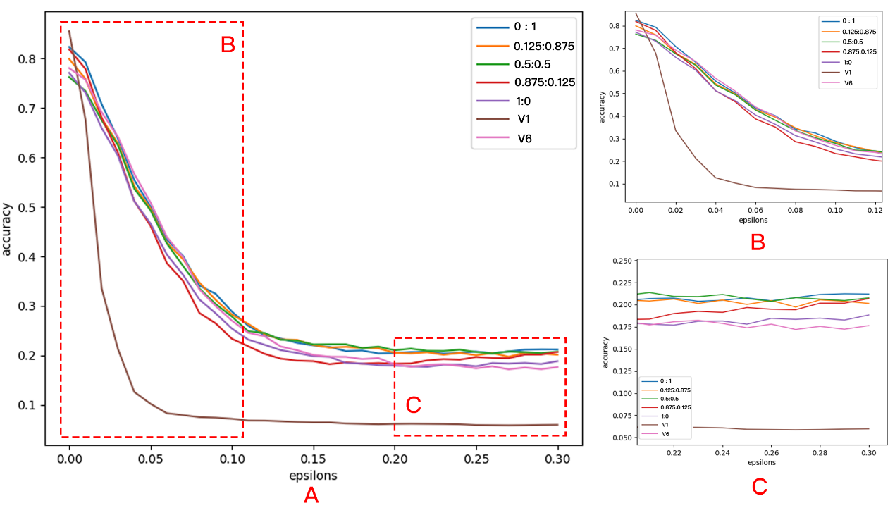 图3 SDA-KFE在FSGM评测标准中不同虚拟样本扩增比例模型鲁棒性表现(V1为对照组),图A显示干扰因素增加时各种扩增比例精度变化情况,图C能够明显体现出SDA-KFE对模型鲁棒性的正向作用。