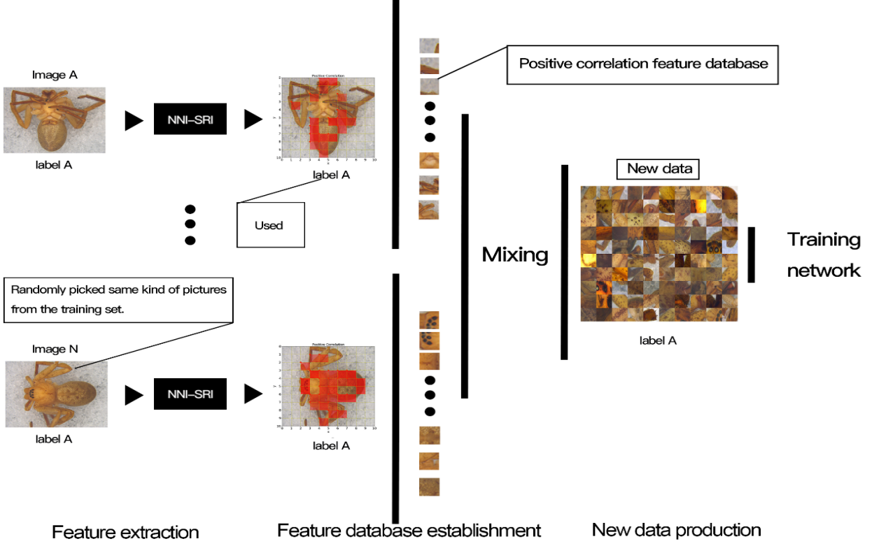 近年,以深度学习为代表的人工智能技术在计算机视觉、自然语言处理和蛋白质结构预测等诸多领域中发挥着越来越重要的作用,然而深度学习模型训练过程中存在着样本稀缺、获取困难、标注费时费力等突出问题,这极大制约了深度学习模型精度和鲁棒性的提升。陈前军老师团队在前期发表NNI-SRI深度神经网络模型解释算法的基础上,通过NNI-SRI分割出样本关键特征区域(特征激活程度不同,定量分析),再随机组合关键特征区域合成含有丰富特征信息的虚拟样本,达到极大化利用样本中既有特征信息目的(过采样),以此提高模型分类准确度,算法思想如图2所示。