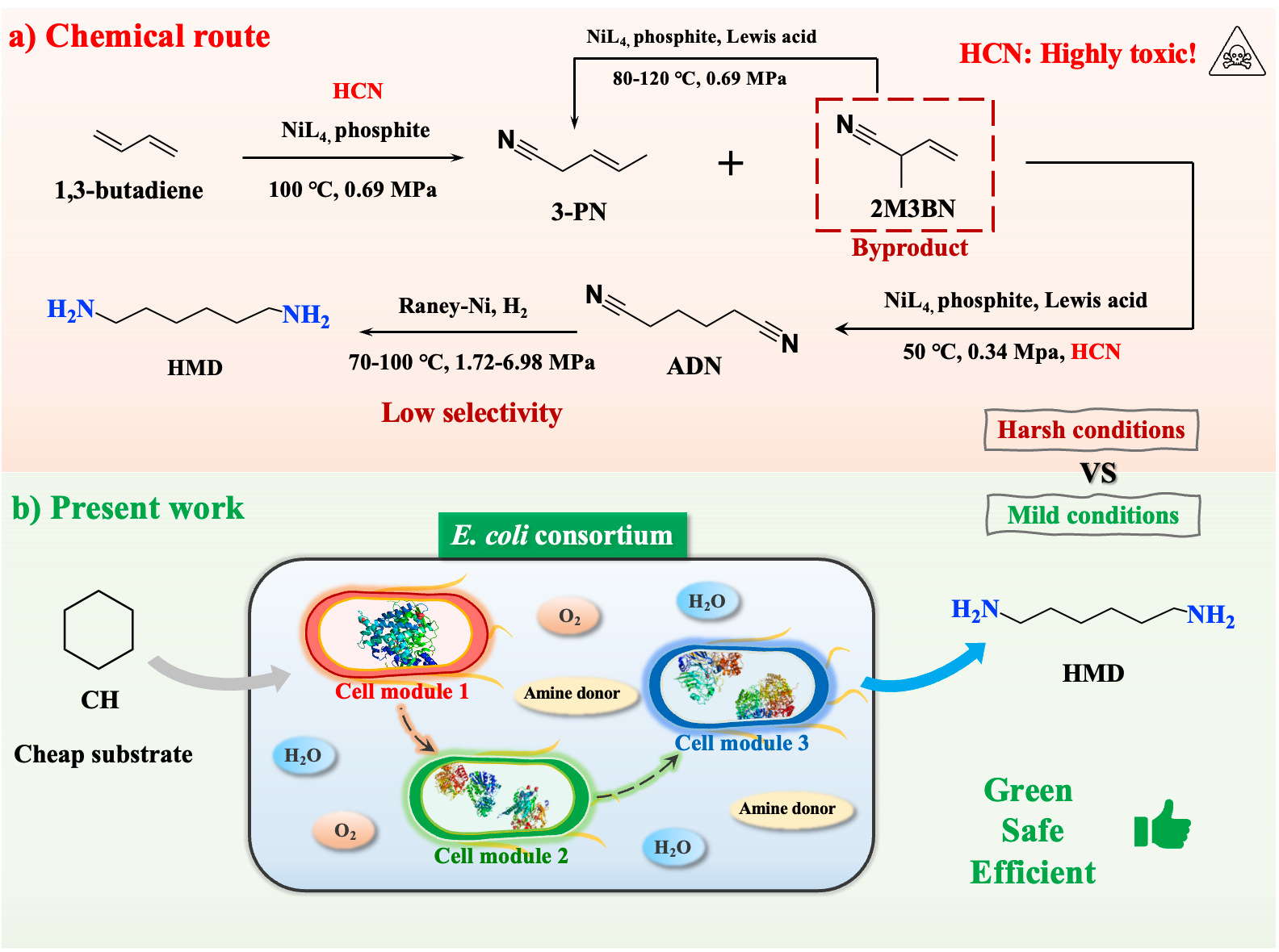 尼龙是世界上出现的第一种合成纤维,它的合成是纤维合成工业的重大突破,更是高分子化学的一个重要里程碑。脂肪族α,ω-二胺是一类重要的大宗化学品,主要用作聚酰胺塑料制造中的单体,在工程塑料、机械配件、纤维、薄膜等材料的制造中具有非常广泛的应用。其中,1,6-己二胺可用作尼龙 66 单体,尼龙 66 是纺织和塑料工业最重要的聚酰胺之一,被大量广泛地应用到众多关系国计民生的重要领域,诸如纺织服装、医药卫生、农业食品、物流运输及军事国防等。 然而,由杜邦开发的主要的1,6-己二胺工业生产工艺是以丁二烯作为起始原料的能源密集型多级化学反应(图 2a)。 虽然成功地大规模应用,但该工艺仍然存在使用剧毒的氰化氢、苛刻的反应条件和不理想的选择性等问题。为了克服这些问题,多年来,科研工作者们不断尝试寻找一种高效绿色的合成方法。