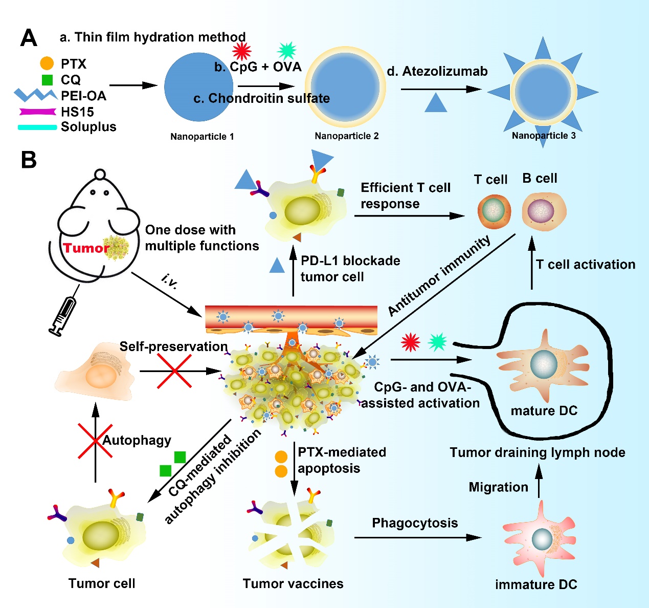 近年来,学者们致力于开发治疗术后残留肿瘤和预防肿瘤复发转移的新方法,包括联合使用化疗、免疫治疗、基因治疗、免疫检查点疗法和CAR-T技术其中的两种或者多种疗法。虽然联合治疗比单独治疗更有效,但由于肿瘤微环境中存在的T细胞较少(免疫“冷”环境),且存在大量的免疫抑制细胞,导致当前联合疗法尚不能满足临床需求。有研究表明肿瘤微环境中的自噬具有关键作用:通过调节免疫应答和免疫细胞的存活、凋亡、分化、激活、效应功能和转移,会促进肿瘤生长。因此,靶向并抑制自噬可能重塑肿瘤微环境,逆转免疫冷环境。此研究创造性地将靶向肿瘤的纳米给药系统与自噬抑制、免疫治疗、免疫检查点疗法和化疗联合起来,实现五位一体的多元化的抗肿瘤效果。