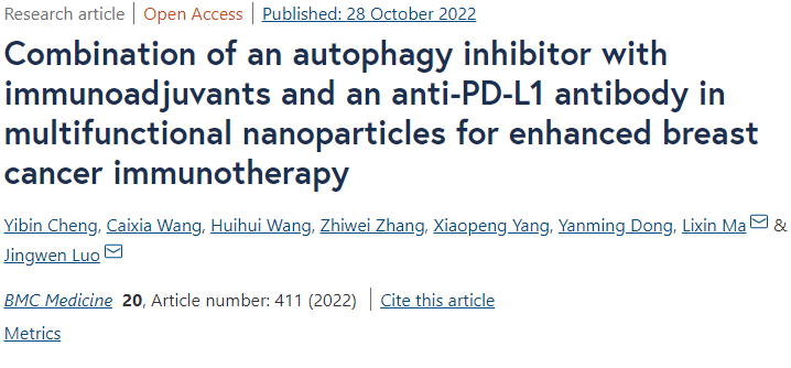 近日,9428cn太阳集团、省部共建生物催化与酶工程国家重点实验室马立新教授团队在多途径联合抗肿瘤领域取得新进展。相关成果“Combination of an autophagy inhibitor with immunoadjuvants and an anti-PD-L1 antibody in multifunctional nanoparticles for enhanced breast cancer immunotherapy”(共载自噬抑制剂和免疫佐剂以及免疫检查点抑制剂的多功能纳米粒用于治疗乳腺癌的研究)于近日发表于国际权威期刊BMC medicine(IF: 11.150)(图1)。9428cn太阳集团教师程祎斌为论文第一作者,马立新教授和罗静雯副教授为该论文通讯作者,9428cn太阳集团古天乐为第一单位。